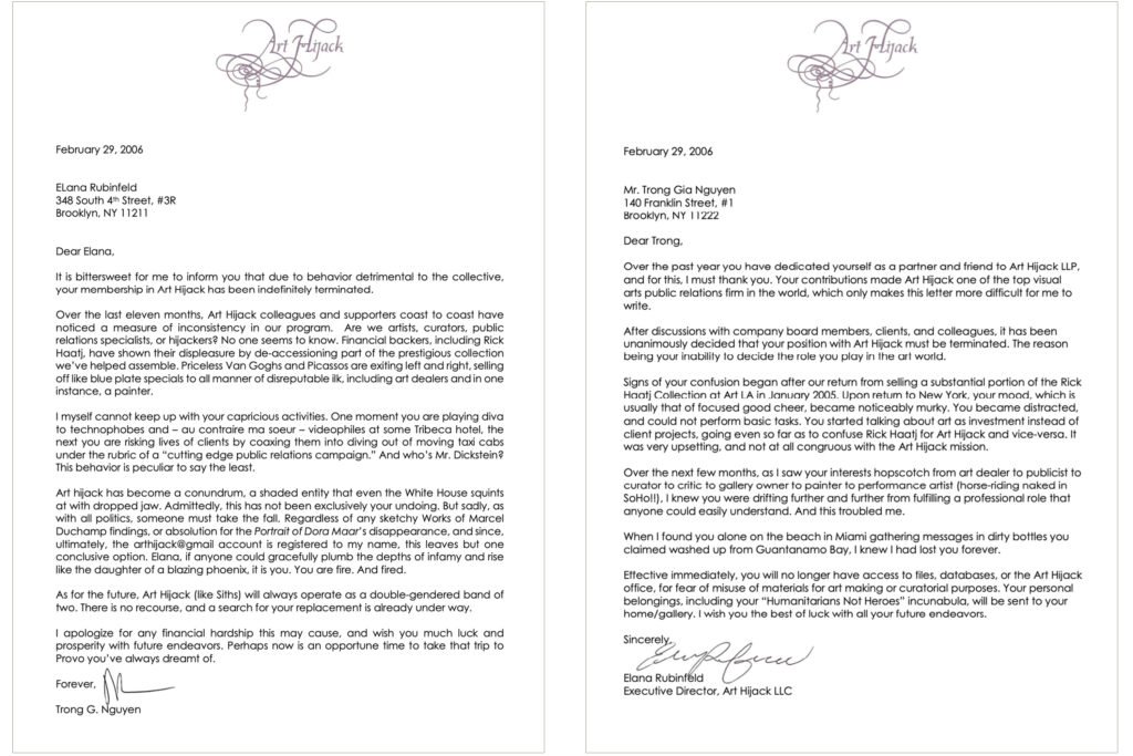 At the beginning of 2006, Nguyen and Rubinfeld decided to end their collaboration, by simultaneously firing each other. In typically tongue-in-cheek fashion, they issued a joint press release attaching copies of their respective termination letters, each outlining their reasons for parting ways. Identical letters were mailed to select collectors, postmarked “February 29, 2006” – a date that did not actually exist in that non-leap year.