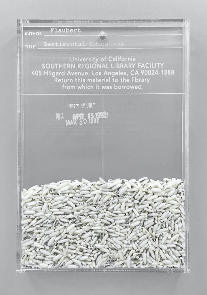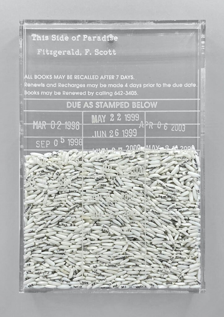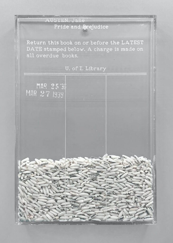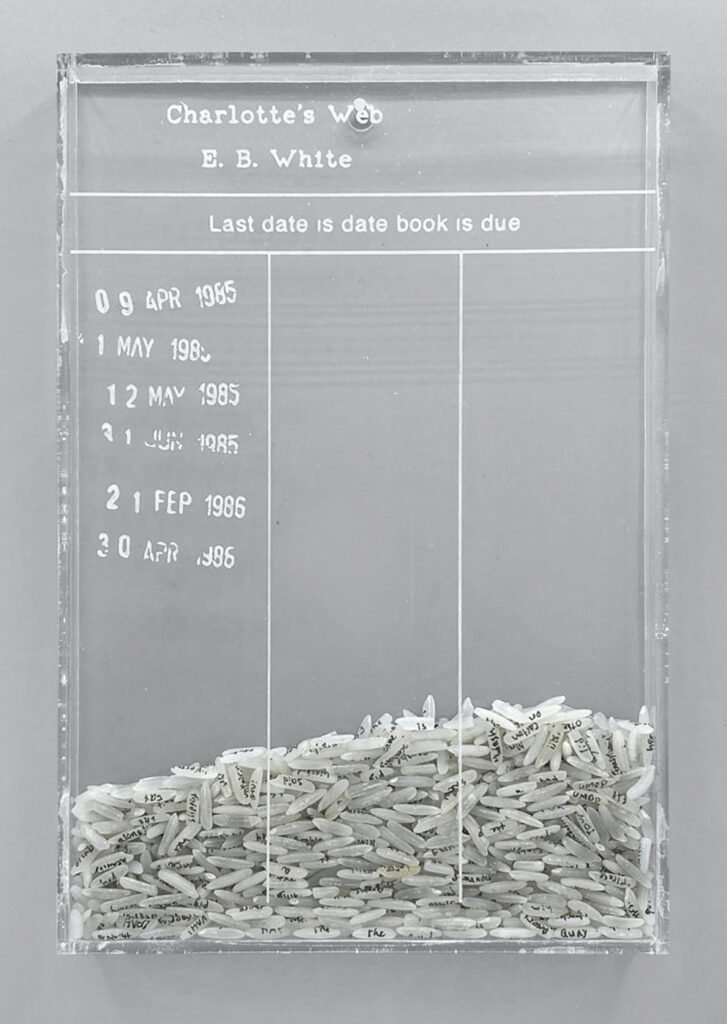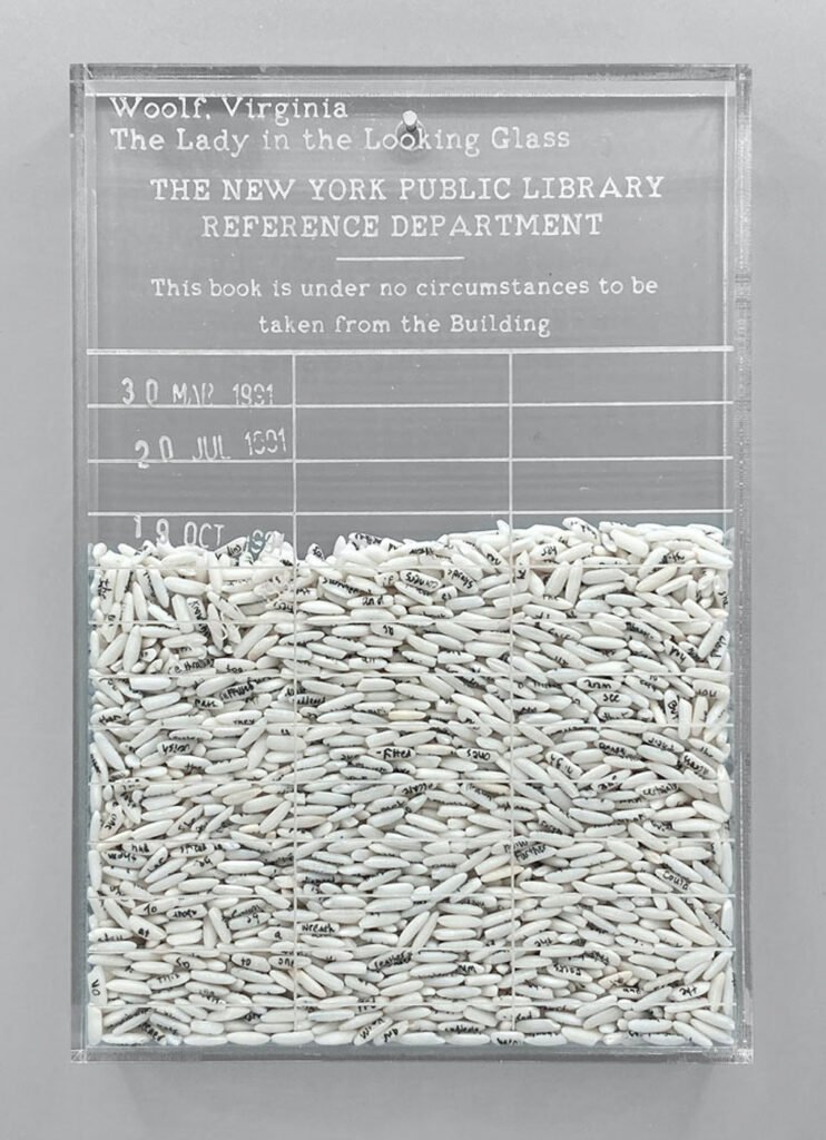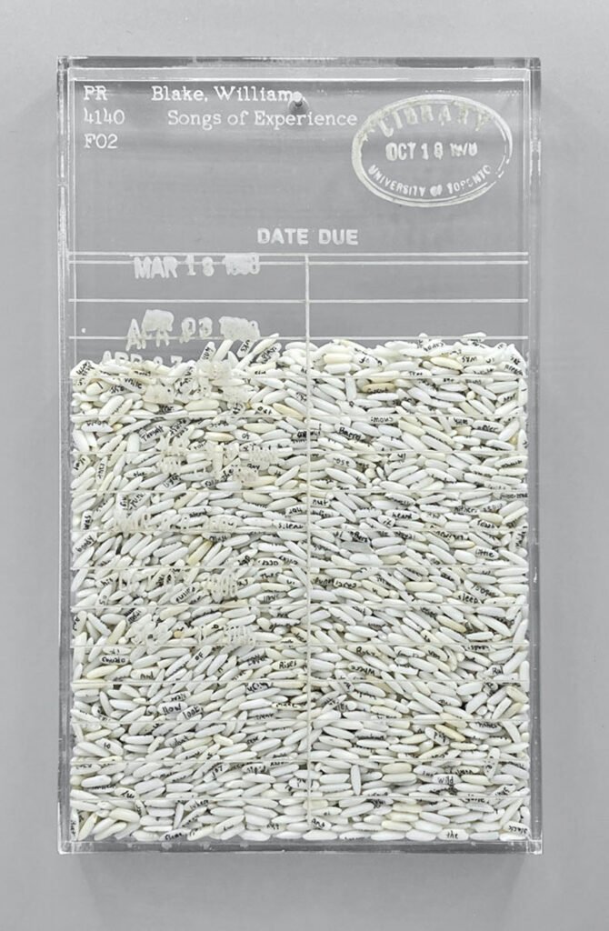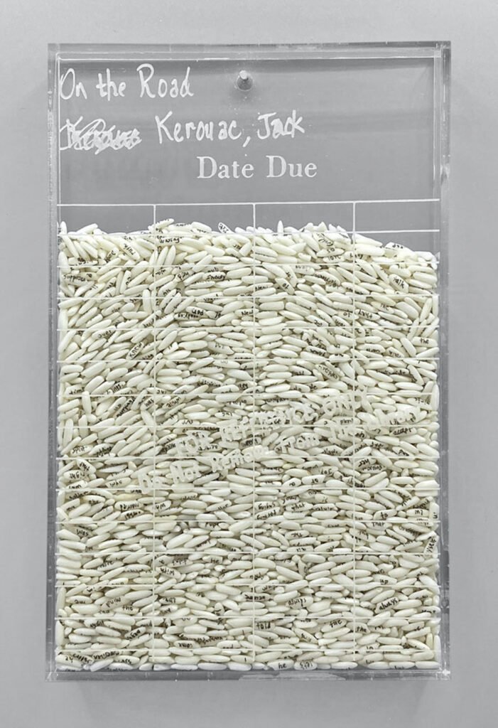 Library (Anthology for Beginners) is a series in which the artist writes singular chapters or the complete text of various literary works, word for word, on individual grains of rice. The project reframes the notion of the library as a repository of knowledge, in particular how books accumulate and disseminate information and ideas. The laborious act of transcribing and slowly reading these texts is equally akin to a manic, meditative type of performance art. Like reciting poetry, the words take on a new context. The act of reading and transcribing, at molasses pace, thus becomes a way of “performing Austen” or “performing Shakespeare.”
