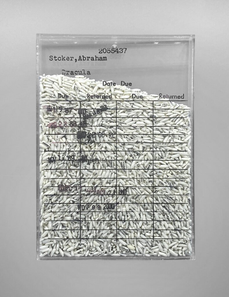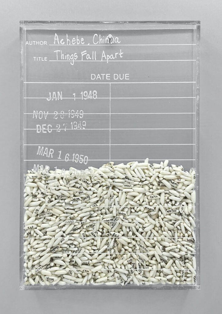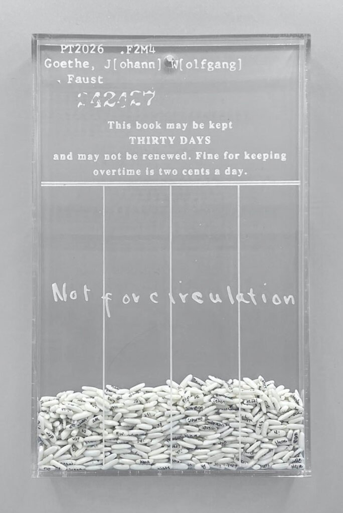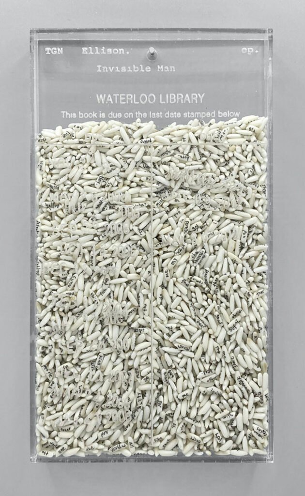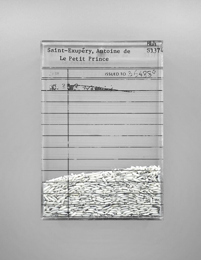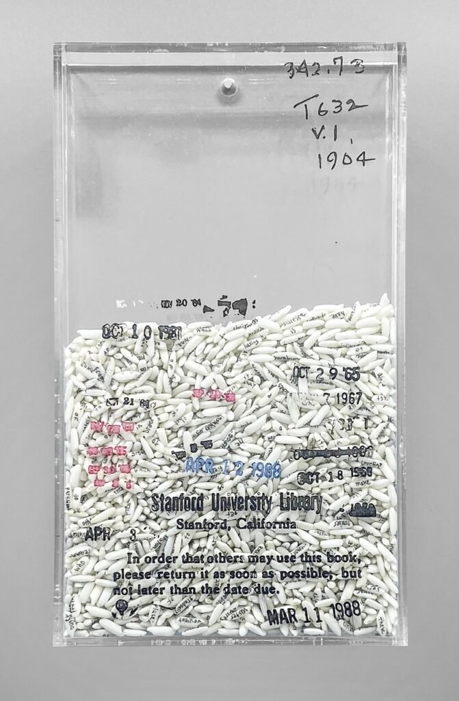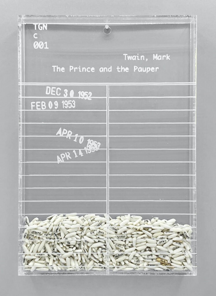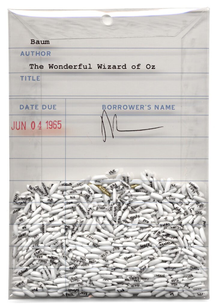 Library (Anthology for Beginners) is a series in which the artist writes singular chapters or the complete text of various literary works, word for word, on individual grains of rice. The project reframes the notion of the library as a repository of knowledge, in particular how books accumulate and disseminate information and ideas. The laborious act of transcribing and slowly reading these texts is equally akin to a manic, meditative type of performance art. Like reciting poetry, the words take on a new context. The act of reading and transcribing, at molasses pace, thus becomes a way of “performing Austen” or “performing Shakespeare.”