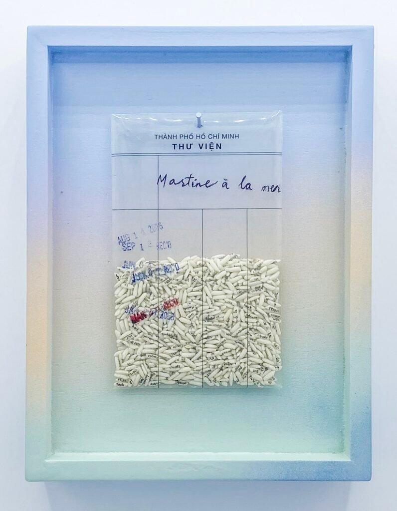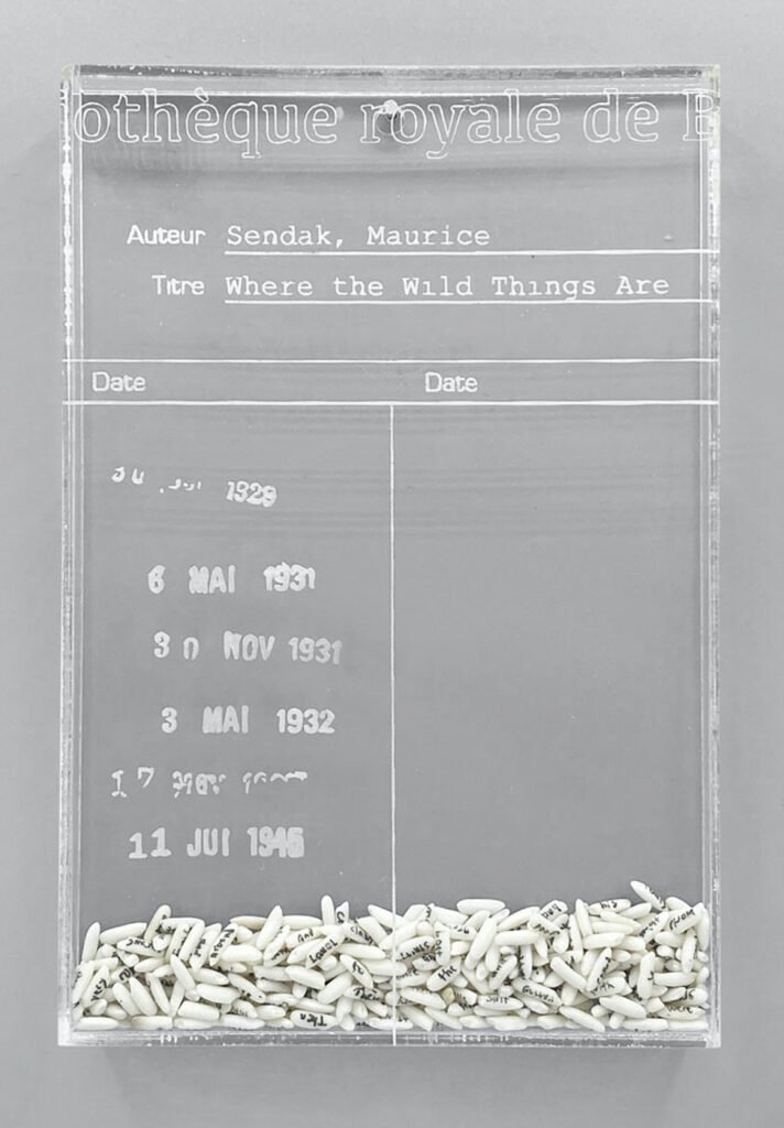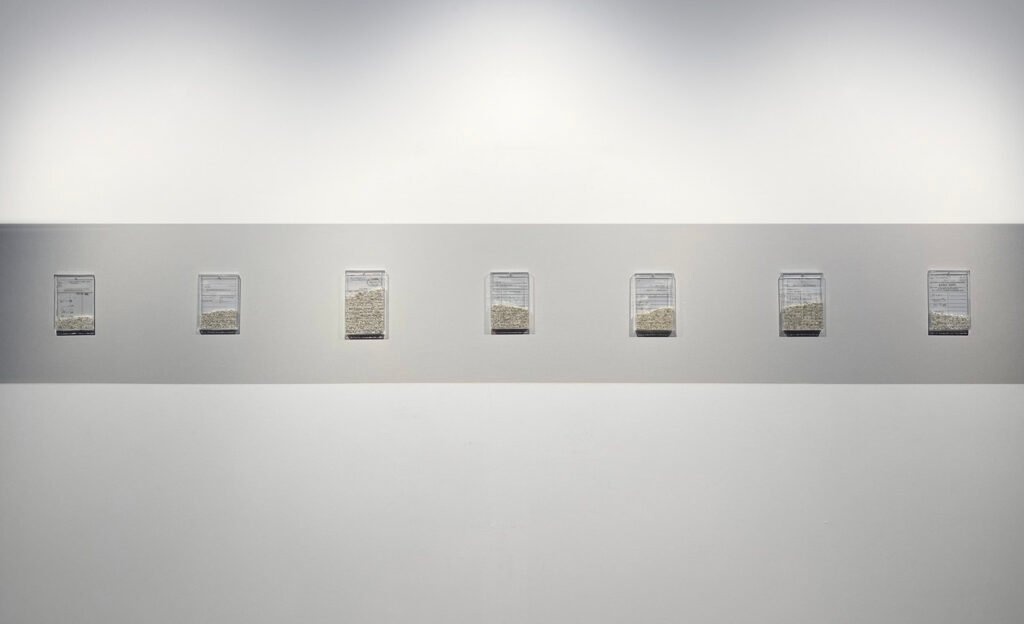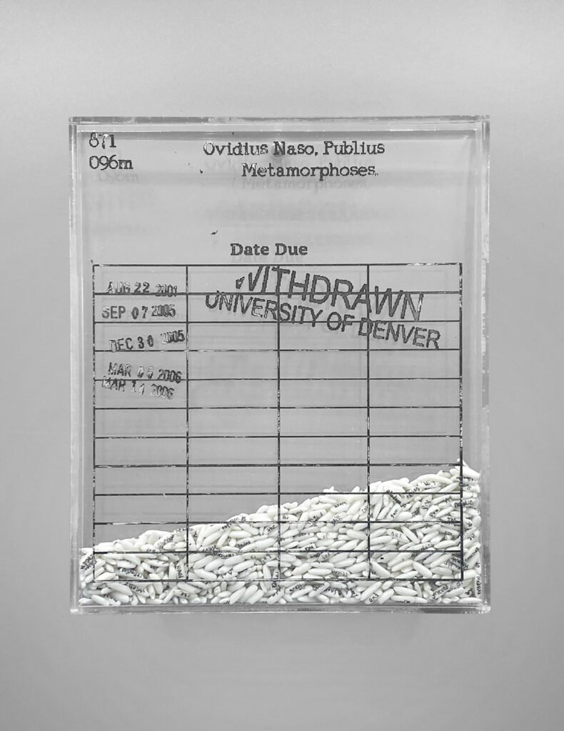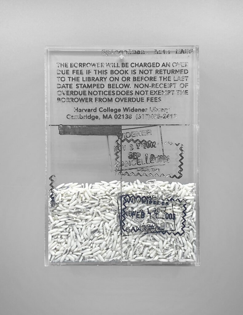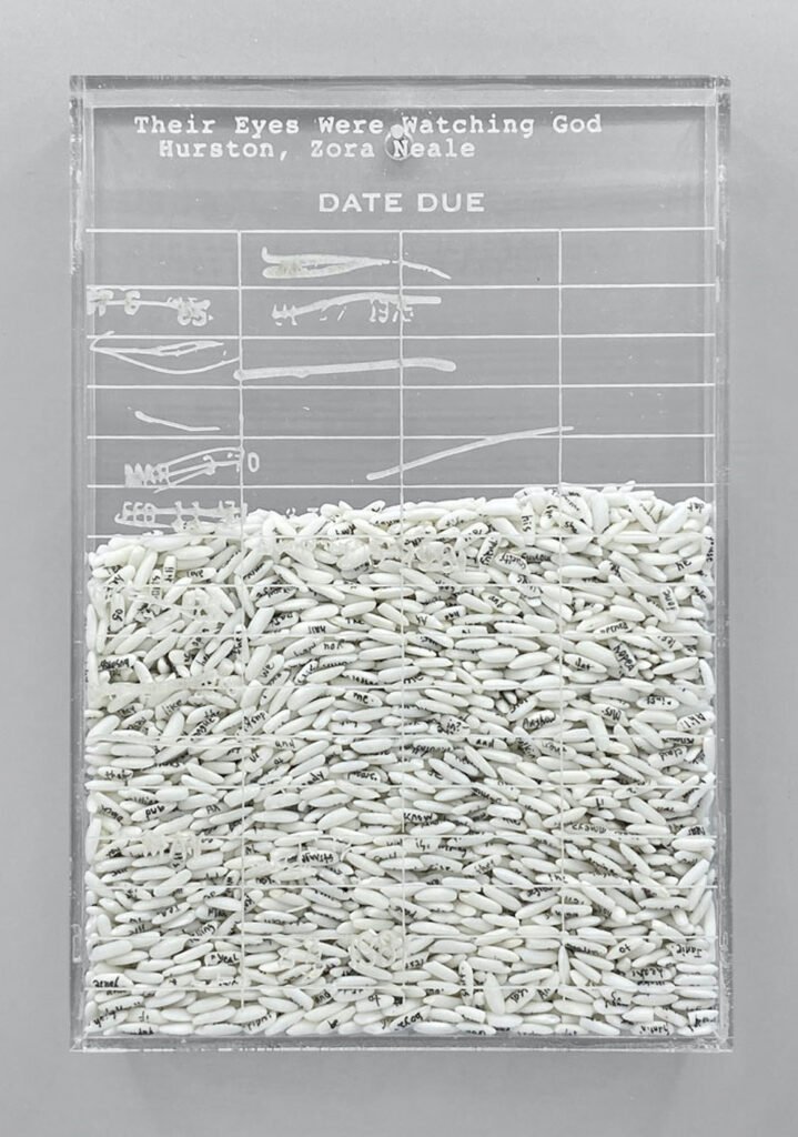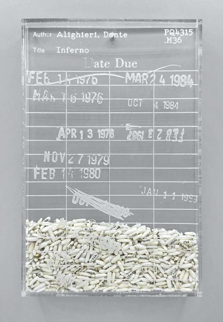 Library (Anthology for Beginners) is a series in which the artist writes singular chapters or the complete text of various literary works, word for word, on individual grains of rice. The project reframes the notion of the library as a repository of knowledge, in particular how books accumulate and disseminate information and ideas. The laborious act of transcribing and slowly reading these texts is equally akin to a manic, meditative type of performance art. Like reciting poetry, the words take on a new context. The act of reading and transcribing, at molasses pace, thus becomes a way of “performing Austen” or “performing Shakespeare.”